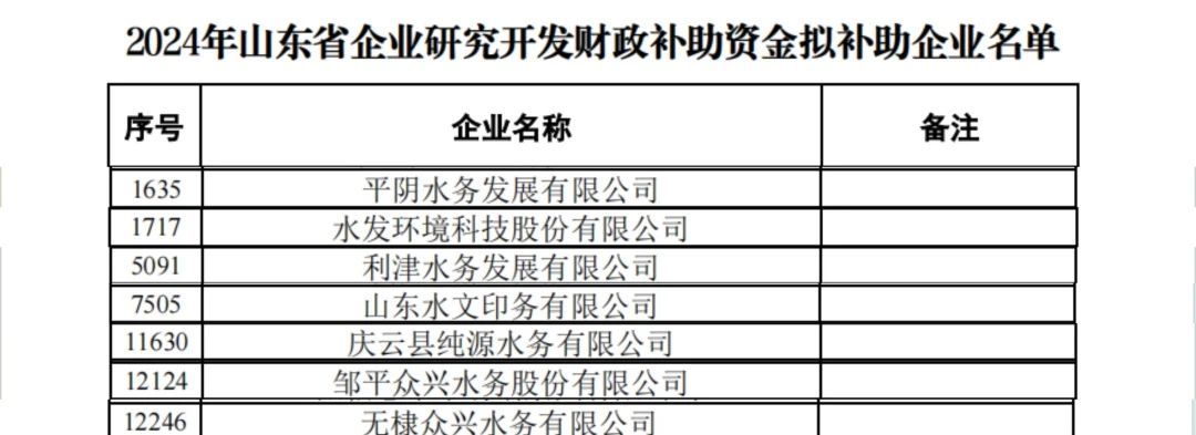 近日,山東省科技廳正式公布了2024年山東省企業(yè)研究開發(fā)財(cái)政補(bǔ)助資金擬補(bǔ)助企業(yè)名單,水發(fā)水控集團(tuán)旗下共有7家企業(yè)成功獲批,取得政府補(bǔ)助33萬元。